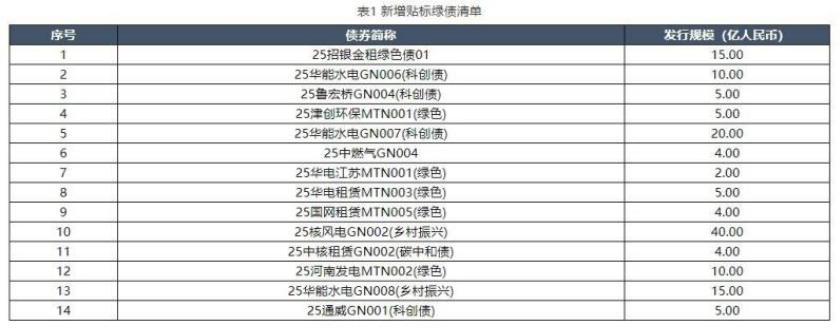 新华财经北京9月1日电外汇交易中心1日发布符合中欧《共同分类目录》标准的中国存量绿色债券清单(2025年8月 版)。为持续提升中欧《可持续金融共同分类目录》(以下简称《共同分类目录》)在支持绿色金融市场发展、尤其是 绿色资本跨境流动中的作用,中国金融学会绿色金融专业委员会专家组按《共同分类目录》开展了对2025年7月银行间 市场新发行绿债的贴标工作。 本次贴标工作共筛选出14只(支持减缓气候变化活动)绿色债券,总规模144.00亿元人民币,其中有7只在发行时已认 证符合《共同分类目录》。相应的技术标准符合《共同分类目录》中"实质性贡献"技术界定标准。具体情况如下: | | 衣 机看短仍然面肩早 | | | --- | --- | --- | | 序号 | 债券简称 | 发行规模 (亿人民币) | | 1 | 25招银金相绿色债01 | 15.00 | | 2 | 25华能水电GN006(科创债) | 10.00 | | 3 | 25鲁宏桥GN004(科创债) | 5.00 | | র্ব | 25津创环保MTN001(绿色) | 5.00 | | રે | 25华能水电GN007(科创债) | 20.00 | ...