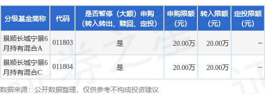 证券之星消息,10月22日景顺长城基金管理有限公司发布《关于景顺长城宁景6个月持有期混合型证券 投资基金暂停接受贰拾万元以上申购及转换转入业务的公告》。公告中提示,为充分保护基金份额持有 人利益,保障基金平稳运作,自2025年10月23日起景顺长城宁景6个月持有期混合型证券投资基金暂停 接受贰拾万元以上申购及转换转入业务,申购、转换转入上限金额为20.0万元,下属分级基金调整明细 如下: 以上内容为证券之星据公开信息整理,由AI算法生成(网信算备310104345710301240019号),不构成 投资建议。 | 分级基金简称 代码 | | 是否暂停(大额)申购 | | 申购限额 转入限额 定投限额 | | | --- | --- | --- | --- | --- | --- | | | | (转入转出、赎回、定投) | (元) | (元) | (元) | | 景顺长城宁景6 月持有混合A | 011803 | 를 | 20.00万 | 20.00万 | | | 景顺长城宁景6 月持有混合C | 011804 | 를 | 20.00万 | 20.00万 | | ...