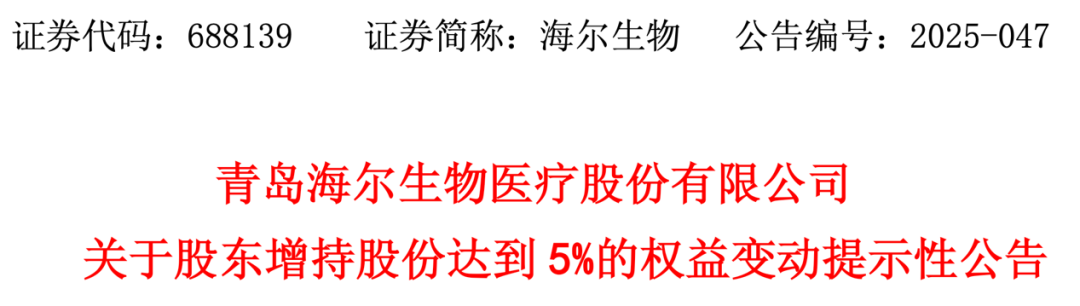 坚定看好公司长期投资价值,海尔生物国资股东增持5%股份