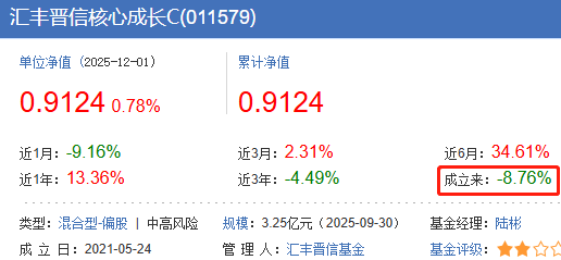 而从前十大重仓股看,汇丰晋信时代先锋混合同样以光伏板块为重仓方向,三季度前十大重仓股为 信义光能、通威股份、晶澳科技、协鑫科技、天合光能、隆基绿能、爱旭股份、福莱特玻璃、大全能 源、东方日升。 中国经济网北京12月2日讯 据同花顺iFinD数据显示,2025年11月份,汇丰晋信基金公司旗下共有 12只基金(各份额分开计算,下同)跌幅超过8%,而这些基金全部由陆彬管理。 汇丰晋信研究精选混合跌幅最大,11月份下跌9.97%。资料显示,该基金成立于2022年1月21日, 一直由陆彬单独管理,但截至今年12月1日收盘,其累计收益率依然亏损3.23%。 从2025年前三个季度的重仓股看,其投资方向主要以新能源产业为主,其中又多集中在光伏领域。 三季报显示,前十大重仓股为亿纬锂能、晶澳科技、信义光能、通威股份、协鑫科技、隆基绿能、爱旭 股份、福莱特、杭可科技、明阳智能。 跌超9%的还有汇丰晋信核心成长混合C、汇丰晋信核心成长混合A,在11月也下跌了9.87%和 9.83%。这只成立于2021年5月24日的基金同样在陆彬4年多的管理下依然出现亏损,其最新累计收益率 分别为-8.76%、-6.67%。 | 汇丰晋信核心成长 ...