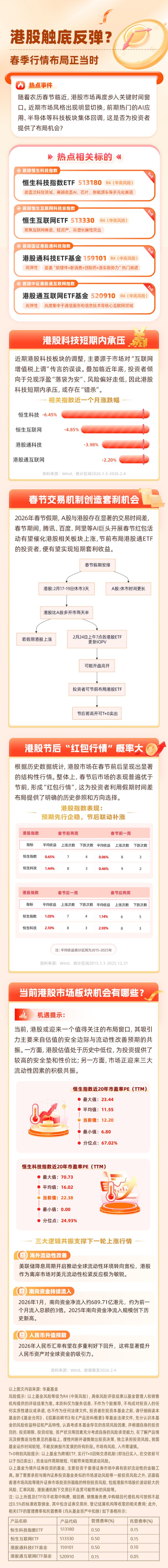 来源:市场资讯 (来源:华夏基金财富家) 蛋股通科技ETF基金 159101 R4(中高 高弹性 覆盖"坎硬件+新消费+创新药+造车新势力"热门 6 跟踪中证港股通互联网指数 港股通互联网ETF基金 520910 R4 高弹性 高度集中于通信服务和信息技术等核心互联网 港股科技短期内承压 近期港股科技板块的调整,主要源于市场对"互联网 增值税上调"传言的误读。叠加临近年底,投资者倾 向于兑现浮盈"落袋为安"、风险偏好走低,因此港股 科技短期内承压,或存在"错杀"。 - 相关指数近一个月涨跌幅 - 恒生科技 -6.45% 恒生互联网 港股通科技 港股通互联网 资料来源:Wind,统计区间2026.1.5 春节交易机制创造套利机 2026年春节假期, A股与港股存在显著的交易时间差, 春节期间,腾讯、百度、阿里等AI巨头开展春节红包活 动有望催化港股相关板块上涨,节前布局港股通ETF 的投资者,便有望实现短期套利收益。 春节假期安排 港股:2月17-19日休市3天 A股:休市时间更长 港股比A股多开市两天半 2月24日上午7点各港股ETF 若假期港股上涨 更新IOPV 可能开盘高开 投资者可节前布局港股ETF 节 ...