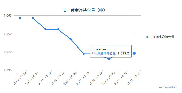 截至10月30日,全球最大黄金ETF--SPDR Gold Trust持仓较上日增加4.3吨,当前持仓量为1040.35吨