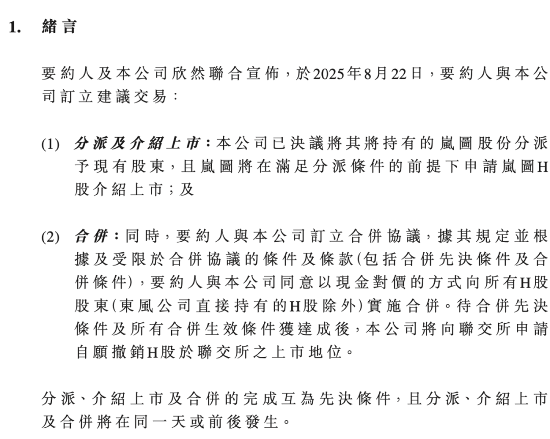 Core Viewpoint - Dongfeng Group's subsidiary, Lantu Automotive, will go public in Hong Kong through an introduction listing, while Dongfeng Group will simultaneously complete its privatization and delisting [1][3] Group 1: Transaction Structure - The transaction will utilize a combination of "equity distribution + absorption merger" [1] - In the first phase, Dongfeng Group will distribute 79.67% of its shares in Lantu Automotive to all shareholders based on their holding ratios [1] - In the second phase, Dongfeng Motor's wholly-owned subsidiary will pay equity compensation to Dongfeng Group's controlling shareholder and cash compensation to other minority shareholders, achieving 100% control over Dongfeng Group [1] Group 2: Valuation and Market Position - Dongfeng Group has experienced low valuation performance, with its stock market value consistently below net assets due to industry transformation pains [3] - The company has not conducted any equity refinancing since its listing, losing the financing function of its H-share platform [3] - In contrast, Lantu Automotive, as a high-end smart electric vehicle brand, has shown strong growth and is considered one of Dongfeng's most valuable and promising assets [3] Group 3: Future Prospects - Following the Hong Kong listing, Lantu Automotive aims to broaden its financing channels, enhance brand image, and expand international operations [3] - The company is expected to further stimulate its value creation capabilities and fully unleash its growth potential due to its leading technology, quality products, and broad market prospects [3]