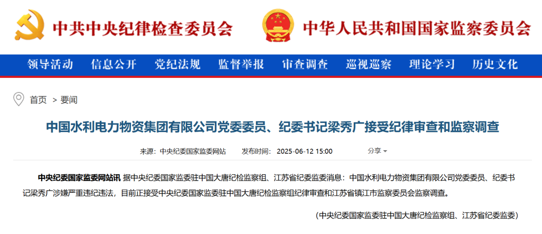 【导读】中国水利电力物资集团有限公司党委委员、纪委书记梁秀广接受纪律审查和监察调查 6月12日,中央纪委国家监委官网通报:中国水利电力物资集团有限公司党委委员、纪委书记梁秀广涉嫌严重违纪违法,目前正接受中央纪委国家监委驻 中国大唐纪检监察组纪律审查和江苏省镇江市监察委员会监察调查。 梁秀广曾在港股上市公司大唐环境工作多年,曾任该公司自动化事业部副总经理、物资管理部副主任(主持工作)、物资管理部主任、科技工程公司总经 理、副总经理、董事会秘书等职务。 2024年11月,大唐环境发布公告称,由于工作调整,梁秀广已辞去该公司副总经理职务。辞任后,梁秀广不再担任大唐环境及附属公司职务。同月,梁秀 广任中国水利电力物资集团有限公司党委委员、纪委书记。 今年1月,梁秀广曾以"中国水利电力物资集团有限公司党委委员、纪委书记"的身份到大唐陕西发电公司进行工作交流。双方就纪检工作开展情况进行了 交流,分享了彼此的经验做法。 此次梁秀广系任上被查。截至记者发稿,中国水利电力物资集团有限公司官网"领导团队"板块已无梁秀广的信息。 据悉,中国水利电力物资集团有限公司前身为1955年成立的电力工业部供应司,先后经历了国家水利电力部供应 ...