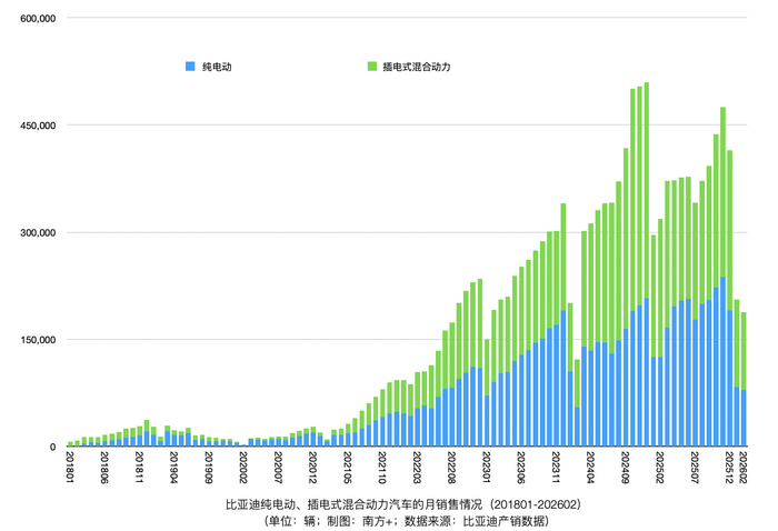 比亚迪发布2026年2月新能源汽车产销数据,当月产量、销量较去年同期均出现显著下滑,本年累计产 销同样同比走低,但公司2月出口量与电池装机量展现出强劲表现,成为本期数据中的亮点。尤其是比 亚迪汽车单月出口量比重首次过半,加上公司发布新消息,股价收盘迎来超8%的暴涨。 数据显示,产量方面,比亚迪2026年2月新能源汽车产量为175280辆,去年同期为334124辆,同比下滑 47.54%;本年累计产量407638辆,较去年累计的661988辆同比下降38.4%。 销量方面,2月单月售出190190辆,去年同期为322846辆,同比下滑41.09%;本年累计销量400241辆, 对比去年累计的623384辆,同比降幅达35.8%。 从细分品类来看,乘用车为产销主力,且降幅与整体基本持平。 2月乘用车产量172525辆,本年累计400360辆,同比下降38.7%;2月销量187782辆,本年累计393300 辆,同比下降36.0%。其中纯电动乘用车2月产量77018辆、销量79539辆,本年累计产量165089辆、销 量162788辆,累计同比分别下降37.3%、35.0%;插电式混合动力乘用车2月产量95507辆 ...
