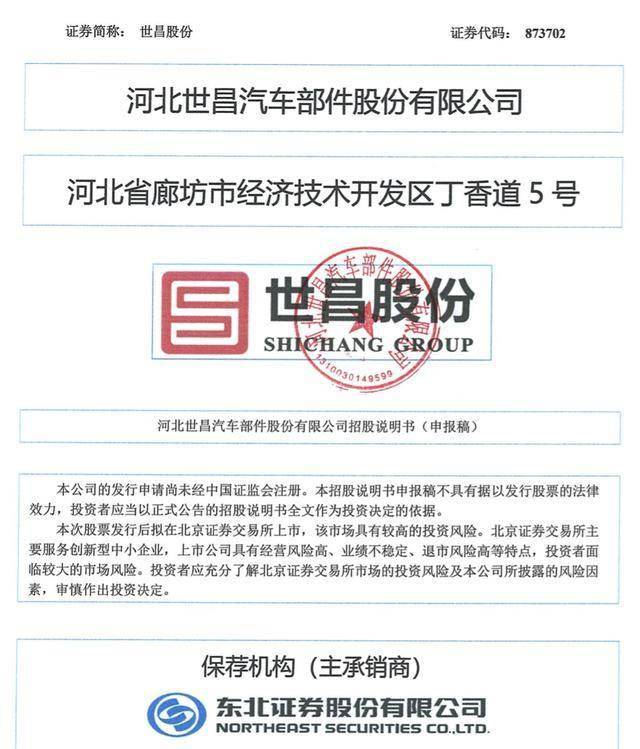 瑞财经 吴文婷5月26日消息,河北世昌汽车部件股份有限公司(以下简称"世昌股份")北交所IPO将于5月30日上会迎考,保荐机构为东北证券股份有 限公司。 世昌股份的主营业务为汽车燃料系统的研发、生产和销售,主要产品为汽车塑料燃油箱总成。公司主要面向整车制造企业进行销售,主要产品具有轻 量化、低排放、抗静电、低噪音、安全性高等特点,主要客户包括吉利汽车、奇瑞汽车、中国一汽、长安汽车等国内主流整车制造企业。 据招股书,2022年-2024年,世昌股份实现营收分别为2.82亿元、4.06亿元、5.15亿元;归母净利润分别为1811.59万元、5193.26万元、6923.95万元。 | 项目 | 2024年12月31日 | 2023年12月31日 | 2022年12月31日 | | --- | --- | --- | --- | | | /2024年度 | /2023年度 | /2022年度 | | 资产总计(元) | 448, 652, 616. 20 | 444, 660, 277. 89 | 346, 718, 530, 57 | | 股东权益合计(元) | 222, 927, 388. 75 | 165, ...
