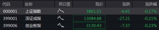 凤凰网财经讯 12月16日,三大指数集体低开,沪指低开0.17%,深成指低开0.21%,创业板指低开 0.23%,贵金属、白酒、电子化学品等板块指数跌幅居前。 | | | | | 秘密斯曼带张兵 | | | | | --- | --- | --- | --- | --- | --- | --- | --- | | 名称 *● | 咸新 | 涨幅% | | 涨跌 涨跌家数 涨速% | | 点手 | 现手 金额 | | 上证指数 | 3861.51 | -0.17 | -6.41 | 667/1234 | -0.01 | 4437 | 443万 58.48 7. | | 深证成指 | 13084.88 | -0.21 | -27.21 | 755/1633 | -0.05 | 726万 | 726万 91.73亿 | | 北证50 | 1429.07 | -0.20 | -2.88 | 114/116 | -0.02 | 7.62万 | 7.62万 1.80 乙 | | 创业板指 | 3130.43 | -0.23 | -7.37 | 359/809 | 0.00 | 1337 | 133万 30.25亿 | 机 ...