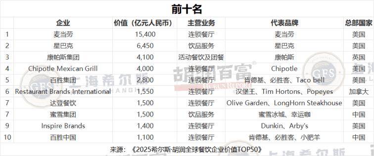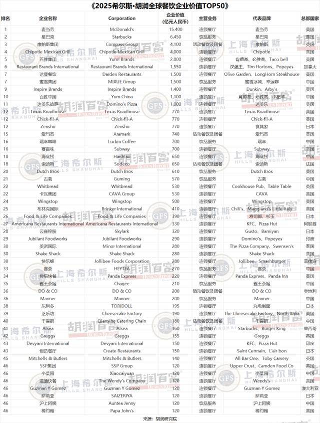 2025胡润全球餐饮企业价值TOP50发布,11家中国企业上榜