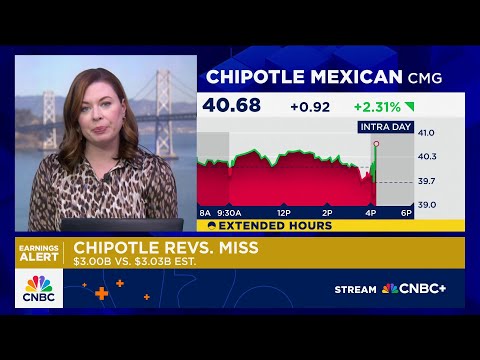 [Music] Hey, John. The stock kind of bouncing around a bit in the after hours here. Now it's higher by more than 3%.Its third quarter results essentially uh in line for Chipotle. The company lowering though its fullear same store sales guidance. Now for the third quarter in a row, it now expects low singledigit decline versus a prior forecast of flat.Now that's despite its EPS coming in right in line at 29 cents. Revenue is also in line at 3 billion for the quarter. Same store sales also up 0.3%.Its average ...