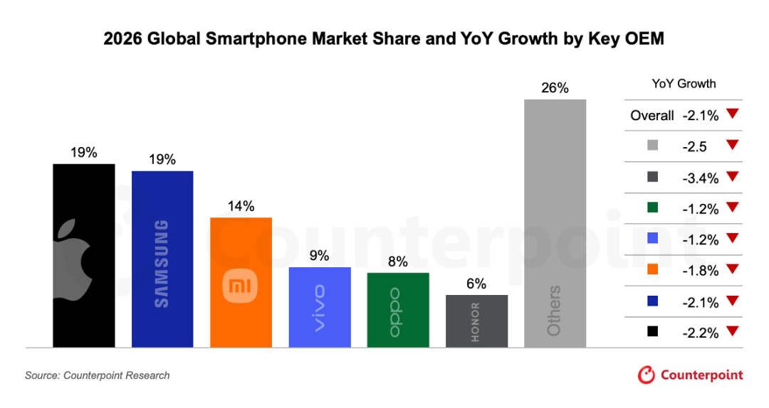 以下文章来源于Counterpoint 咨询 ,作者Counterpoint Counterpoint 咨询 . Counterpoint Research 是一家专注于科技行业的全球性研究公司,在全球主要的市场有着强大的影响 力。我们致力于为合作伙伴提供准确、及时的市场数据,帮助他们做出明智的决策。 受存储成本上升影响,2026 年全球智能手机出货量预期将年减 2.1%。 根据 Counterpoint Research 最新《全球智能手机出货追踪与预测》 ,零部件成本上升预期将影响 终端需求,2026 年全球智能手机出货量可能出现2.1% 的下滑。 2026 年主要OEM全球智能手机市占与年增率(E) 资料来源:Counterpoint Research《全球智能手机出货追踪与预测》,2025 年 12 月更新 注:因四舍五入,数据加总可能不等于100% 此次 2.1% 的年减幅度,相当于 Counterpoint Research 将 2026 年出货预测下修 2.6 个百分点。其 中,HONOR、OPPO 与 vivo 等中国 OEM 与先前预估相比,修正幅度较为显著。 2026 年智能手机出货年增率 ...
