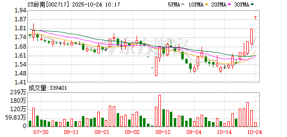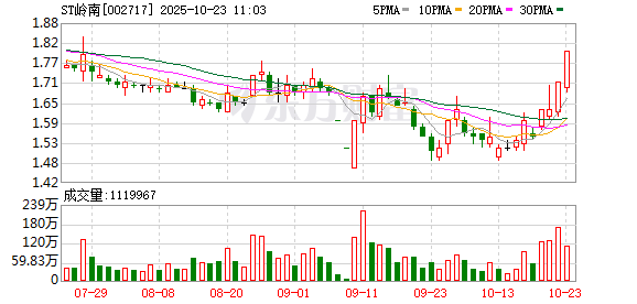 (文章来源:证券时报网) ST岭南再度涨停,5个交易日内录得4个涨停,累计涨幅为21.94%,累计换手率为33.75%。截至9:29, 该股今日成交量1082.71万股,成交金额2046.32万元,换手率0.67%。最新A股总市值达34.40亿元,A股 流通市值30.53亿元。(数据宝) 近日该股表现 | 日期 | 当日涨跌幅(%) | 换手率(%) | 主力资金净流入(万元) | | --- | --- | --- | --- | | 2025.10.23 | 5.26 | 7.16 | 1573.28 | | 2025.10.22 | 4.91 | 10.37 | 3113.64 | | 2025.10.21 | 0.00 | 7.84 | -2664.31 | | 2025.10.20 | 5.16 | 7.71 | 4671.52 | | 2025.10.17 | -3.13 | 3.40 | -759.59 | | 2025.10.16 | 3.90 | 5.84 | 1601.11 | | 2025.10.15 | 1.32 | 2.44 | 596.81 | | 2025.10.14 | 0.0 ...