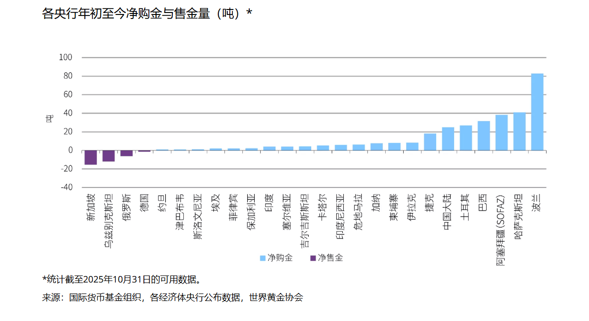 黄金价格一度再创新高。 12月24日,受地缘政治紧张局势升级,以及市场预期美国将进一步降息影响,国际金价史上首次突破4500美元大关。 中东和俄乌的地缘政治冲突持续,加上美国政府的关税政策等等,市场全年的不确定性一直在持续。黄金作为避险资产,其抗通胀、抵御地缘风险的价值在 今年愈发凸显,价格自然不断推高。 同时,各国尤其是新兴市场央行的购金热情不减,以寻求资产的多元与稳定,也为金价提供了坚实支撑。那么,到底是哪些国家或地区买得最多呢? 波兰买了最多黄金 根据世界黄金协会12月发布最新数据,截至10月底,全球央行年内累计报告购金量为254吨,维持稳固增长。其中10月当月,全球央行净购金规模达53吨, 环比增长36%。 具体到国家,截至10月底,波兰国家银行是全球最大的官方黄金买家,其购买量达到了83吨,排名第二的是哈萨克斯坦央行,购买量为41吨。阿塞拜疆国家 石油基金(主权财富基金)则排名第三,购买了38吨黄金,创该国历史新高。 但这样的新闻并不新鲜,今年以来,黄金已超50次的刷新历史新高:从年初的2650美元/盎司左右起步,一路高歌猛进,目前已累计上涨超70%,这是自 1979年石油危机以来,最强劲的年度表现 ...