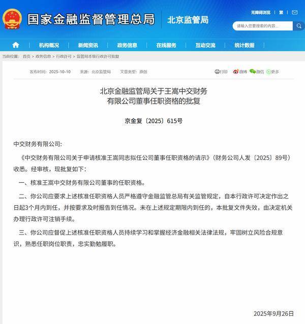 彭陆强获批担任中交财务公司董事长 李金明、王嵩分别获批担任公司副董事长、董事