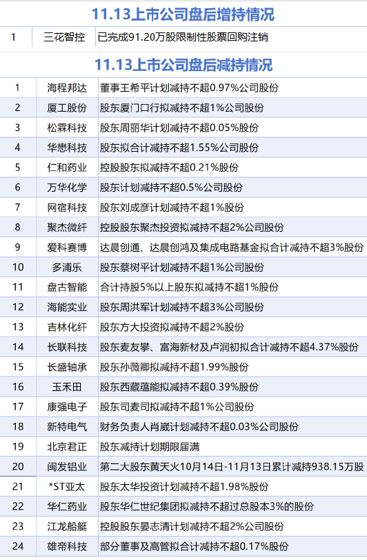 据统计,11月13日,盘后三花智控披露增持情况。包括海程邦达、厦工股份、松霖科技、华懋科技、仁 和药业、万华化学、网宿科技、聚杰微纤、爱科赛博、多浦乐、盘古智能、海能实业、吉林化纤、长联 科技、长盛轴承、玉禾田、康强电子、新特电气、北京君正、*ST亚太、闽发铝业、华仁药业、江龙船 艇、雄帝科技在内的24家A股上市公司披露减持情况。 | | | 11.13上市公司盘后增持情况 | | --- | --- | --- | | 1 | 三花智控 | 已完成91.20万股限制性股票回购注销 | | | | 11.13上市公司盘后减持情况 | | 1 | 海程邦达 | 董事王希平计划减持不超0.97%公司股份 | | 2 | 厦工股份 | 股东厦门口行拟减持不超1%公司股份 | | 3 | 松霖科技 | 股东周丽华计划减持不超0.05%股份 | | 4 | 华慰科技 | 股东拟合计减持不超1.55%公司股份 | | 5 | 仁和药业 | 控股股东拟减持不超0.21%股份 | | 6 | 万华化学 | 股东计划减持不超0.5%公司股份 | | 7 | 网宿科技 | 股东刘成彦计划减持不超1%股份 | | 8 | 聚杰微纤 ...