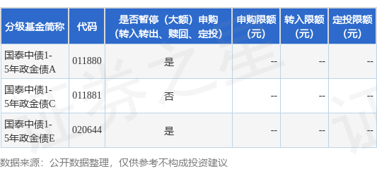 2、本基金C类基金份额已于2024年1月22日起暂停申购、定期定额投资及转换转入业务,本次相关业务 金额限制仅适用于本基金A类、E类基金份额,不涉及C类基金份额。 以上内容为证券之星据公开信息整理,由AI算法生成(网信算备310104345710301240019号),不构成 投资建议。 注:1、自2025年12月5日起,对本基金A类、E类基金份额的申购、定期定额投资及转换转入业务的金额 进行限制。单日每个基金账户的累计申购、定期定额投资及转换转入业务的金额不应超过1,000,000.00 元,如单日每个基金账户的累计申购、定期定额投资及转换转入业务的金额超过1,000,000.00元,本基 金管理人将有权部分或全部确认失败; 证券之星消息,12月5日国泰基金管理有限公司发布《关于国泰中债1-5年政策性金融债指数证券投资基 金暂停大额申购、定期定额投资及转换转入业务的公告》。公告中提示,为维护基金份额持有人利益, 自2025年12月5日起国泰中债1-5年政策性金融债指数证券投资基金暂停大额申购、定期定额投资及转换 转入业务,申购、转换转入上限金额为100.0万元,下属分级基金调整明细如下: | 分级基金简称 ...