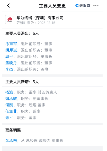 据天眼查,近日,华为终端(深圳)有限公司、华为终端有限公司双双发生工商变更,董事长均变更为余承东,法定代表人都变更为魏承敏。同时还有多 位高管发生变更。 华为终端(深圳)有限公司于12月15日发生工商变更 华为终端有限公司于12月12日发生工商变更 华为官网披露的管理层信息显示,当前余承东的职务是华为常务董事、产品投资评审委员会主任、终端BG董事长。 早在2024年4月底,余承东就已转任华为终端BG董事长位,此前他在华为终端BG担任CEO。今年9月,华为还任命余承东为产品投资评审委员会(IRB) 主任。 华为终端(深圳)有限公司成立于2003年12月,注册资本为148.91亿元,华为投资控股有限公司持股67.95%,华为技术有限公司持股32.05%。华为终端有 限公司成立于2012年11月,注册资本6.06亿人民币,由华为终端(深圳)有限公司全资持股。 来源:上海证券报 关注" 新华网财经 "视频号 更多财经资讯等你来看 茅台、五粮液同日官宣! 苹果闪送官宣iPhone免运费 往期推荐 ...