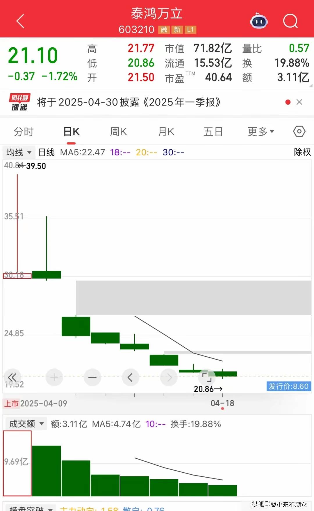 泰鸿万立 603210 融 新 L1 21.77 市值 71.82亿 量比 0.57 高 21.10 20.86 15.53亿 19.88% (EE 流通 换 -0.37 -1.72% 21.50 3.11亿 40.64 开 额 市盈 ™ 同 将于2025-04-30披露《2025年一季报》 X 速诺 分时 日K 月K 五日 更多▼ 周K o 均线 ▼ 日线 MA5:22.47 18 :-- 20 :-- 30 :-- 除权 40.84-39.50 35. 24.85 20.86- 右行价·860 上市 2025-04-09 04-18 成交额 ▼ 额:3.11亿 MA5:4.74亿 10 :-- 换手:19.88% 9.69亿 搜狐号@小东不满仓 #舟尔啦 = 十十六十九· 150 ** 076 60321 603210 默默Z 34040 最新价 38 02 涨跌幅 342.093% 搜狐号@小东不满仓 ����������� 目易 NEW UT-N 泰调万立 四十年十南古 �碓矗涸�碓矗涸 葡萄葡萄酒精品精品精品精品加盟酒店加盟30.44葡萄酒加盟酒店加盟酒店253.95%加盟哪里哪里加19.38酒店酒 ...