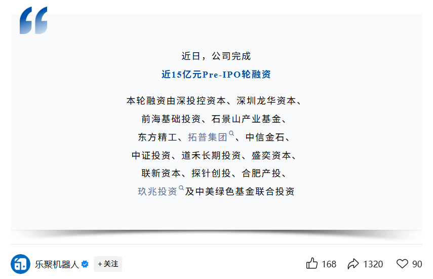 作者 | 趣解商业 赵栀 继宇树科技之后,又一家人形机器人企业明确披露IPO意向。 10月22日,乐聚机器人宣布于近日完成近15亿元Pre-IPO轮融资。 本轮Pre-IPO融资由深投控资本、深圳龙华资本、前海基础投资、石景山产业基金、东方精工、拓普集团、中信金石、中 证投资、道禾长期投资、盛奕资本、联新资本、探针创投、合肥产投、玖兆投资及中美绿色基金联合投资。 乐聚机器人表示,本轮融资将用于强化核心技术研发、深化产业链布局、完善产业场景应用,旨在推动人形机器人迈向 大规模量产与多元化场景应用的新阶段。 图片来源:"乐聚机器人"公众号截图 此外,公司相关负责人向《上海证券报》透露,目前公司已完成股改,IPO计划推进中。 此前9月9日,乐聚机器人完成股改,由原来的"乐聚(深圳)机器人技术有限公司",变更为"乐聚智能(深圳)股份有限 公司"。彼时,公司就股改给出的解释是"出于业务需要"。 另外,乐聚机器人还与海尔、中国移动、江苏亨通等行业领军企业建立战略合作关系。据悉,乐聚机器人去年与红旗等 车企合作,让人形机器人进工厂训练,今年已经开始批量生产和交付,一度"爆单"。今年年初,乐聚第100台全尺寸人形 机器人交付 ...