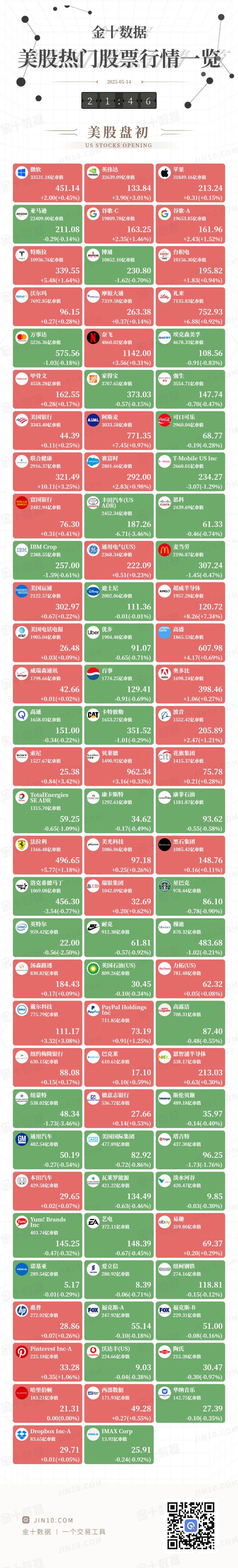 金十图示:2025年05月14日(周三)美股热门股票行情一览(美股盘初)