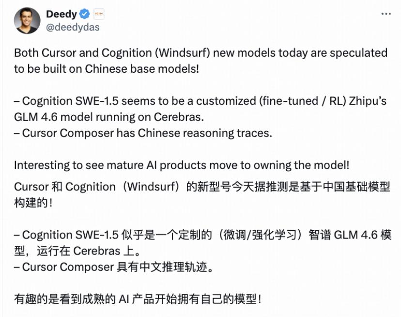 最近,美国最早跑出 PMF 的编程工具 Cursor 和 Windsurf 纷纷推出了自有模型 Composer 和 SWE-1.5。随后,两家模 型均被证实采用中国大模型。 Cursor被全球多地有用户发现在他们输出的代码中会频繁出现中文。当用户直接询问Windsurf,Windsurf回答中明确表 示其模型由中国"智谱 AI"提供。 智谱的官推也来转推祝贺。 这样的情况并不意外,在美国,模型公司和应用企业一直是一种微妙的关系。 今年,在OpenAI计划收购Windsurf时,Anthropic第一时间切断了对其的服务。如今,当越来越多的开源模型在榜单逼 近闭源模型,这些应用公司当然是第一时间欢迎。 这不仅是单个案例。 估值93亿美元的美国平台Vercel宣布将智谱GLM-4.6纳入其官方API服务,全球最大的推理芯片公司Cerebras近期发布 官方邮件称从11月5日起将GLM-4.6作为主推模型。云服务平台Together AI 宣布部署阿里巴巴的Qwen-3-Coder,AI推 理平台Featherless也在Kimi K2发布时即宣布支持其新模型。 让海外产品都纷纷说上"中国话",这是为什么? 01 ...