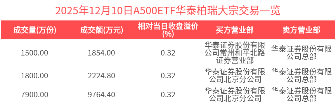 ETF大宗榜 | A500ETF华泰柏瑞(563360):获大宗交易溢价买入1.38亿元,居全市场第一-20251210