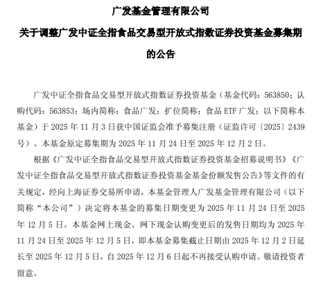 公告称,广发中证全指食品交易型开放式指数证券投资基金(基金代码:563850;认购代码:563853; 场内简称:食品广发;扩位简称:食品ETF广发;以下简称本基金)于2025年11月3日获中国证监会准予 募集注册(证监许可〔2025〕2439号)。 该基金原定募集期为2025年11月24日至2025年12月2日。现决定将该基金的募集日期变更为2025年11月 24日至2025年12月5日。 该基金拟任基金经理姚曦,自2021年11月17日起任职基金经理。 中国经济网北京12月3日讯今日,广发基金管理有限公司发布关于调整广发中证全指食品交易型开放式 指数证券投资基金募集期的公告。 ...