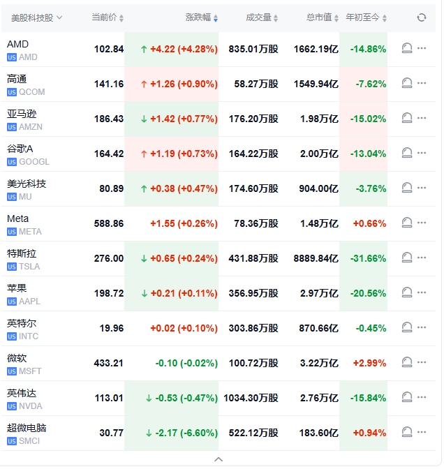 纳指涨0.04%,道指涨0.4%,标普500指数涨0.2%。 AMD涨约4%,公司一季度营收超预期,二季度营收指引也超预期。 | 美股科技股 √ | 当前价 # | 涨跌幅 ◆ 成交量 ÷ | | 总市值 = 年初至今 = | 0 | | --- | --- | --- | --- | --- | --- | | AMD | 102.84 | ↑ +4.22 (+4.28%) 835.01万股 | 1662.19亿 | -14.86% | 0 ... | | us AMD | | | | | | | 高通 us QCOM | 141.16 | ↑ +1.26 (+0.90%) 58.27万股 | 1549.94亿 | -7.62% | = == | | 亚马逊 us AMZN | 186.43 | ↓ +1.42 (+0.77%) 176.20万股 | 1.98万亿 | -15.02% | a … | | 谷歌A | 164.42 | ↑ +1.19 (+0.73%) 164.22万股 | 2.00万亿 | -13.04% | = == | | us GOOGL | | | | | | | 美光科技 us M ...