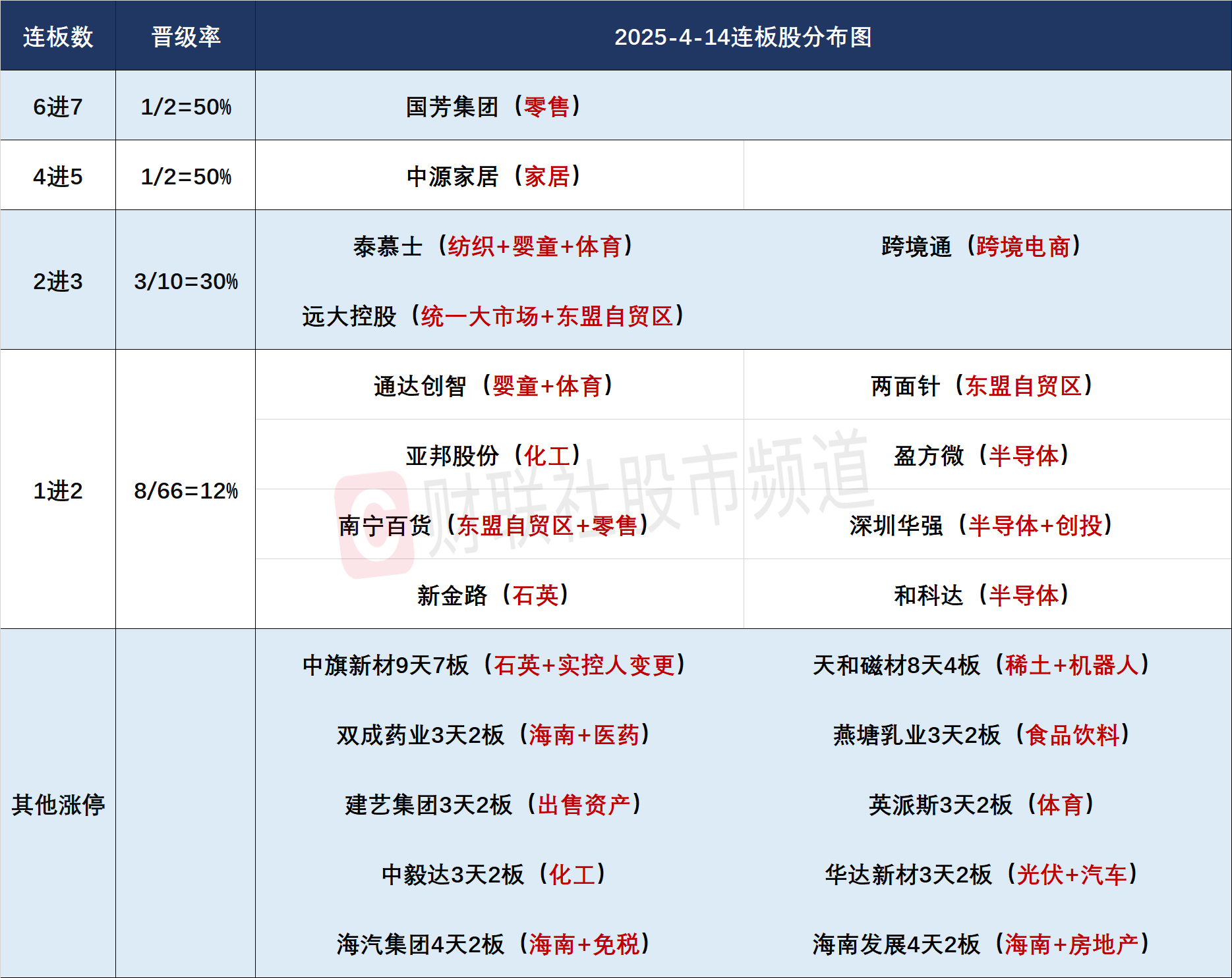 今日共103股涨停,连板股总数13只,其中三连板及以上个股5只,上一交易日共18只连板股,连板股晋级率27.78%(不含ST股、退市股)。个股方面,全 市场超4500只个股上涨,连续5个交易日逾百股涨停或涨超10%,但市场追涨情绪并不积极,连板梯队断层,广宇集团、石英股份、海鸥住工等给出较大负 反馈。另一方面,板块博弈氛围浓厚,消费电子板块高开低走,权重立讯精密盘中一度跌超2%,而集体低开的农业股却得到资金回流,新赛股份午后一度 上演"地天板"。 | 连板数 | 晋级率 | 2025-4-14 | | --- | --- | --- | | 6进7 | 1/2=50% | 国芳集团 (零售) | | 4#5 | 1/2=50% | 中源家居 (家居) | | 2讲3 | 3/10=30% | 泰慕士 (纺织+婴童+体育) | | | | 远大控股 (统一大市场+东盟自贸区) | | 1进2 | 8/66=12% | 通达创智 (婴童+体育) | | | | 亚邦股份(化工) | | | | 南宁百货(东盟自贸区+零售) | | | | 新金路(石英) | | 其他涨停 | | 中旗新材9天7板(石英+实控人变 ...
