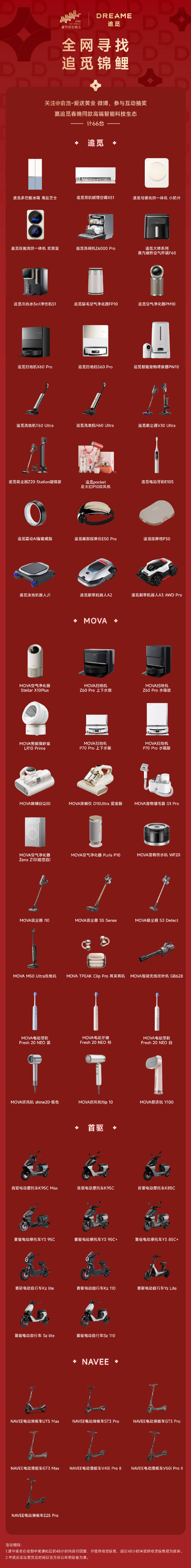 1月28日,追觅科技创始人兼CEO俞浩宣布将抽1位"追觅锦鲤",送上一份追觅生态产品大礼包,从牙 刷、扫地机到电动滑板车、电动摩托车,覆盖4个品牌,共计66个不同产品。 俞浩表示大礼包中是追觅已经开始量产销售的产品,只是生态产品的一部分,未来会有更多产品让大家 体验,包括汽车、手机。 追觅空气净化器PM10 追觅pocket 星火红P10吹风机 追觅冷热冰3in1净饮机S1 追觅猫毛空气净化器FP10 追觅扫地机X60 Pro 追觅扫地机S60 Pro 追觅智能宠物喂食器PW10 追觅洗地机T60 Ultra 追觅洗地机H60 Ultra 追觅吸尘器V30 Ultra 追觅吸尘器Z20 Station旋锋版 追觅震动Al智能戒指 追觅眼部按摩仪E50 Pro 追觅电动牙刷E10S 追觅按摩枕P30 追觅泳池机器人J1 追觅割草机器人A2 追觅割草机器人A3 AWD Pro MOVA * � MOVA扫地机 Z60 Pro 水箱版 MOVA宠物理毛器 G1 Pro MOVA扫地机 P70 Pro 上下水版 MOVA空气净化器 Stellar X10Plus MOVA智能猫砂盆 LR10 Prime MOVA除螨 ...
