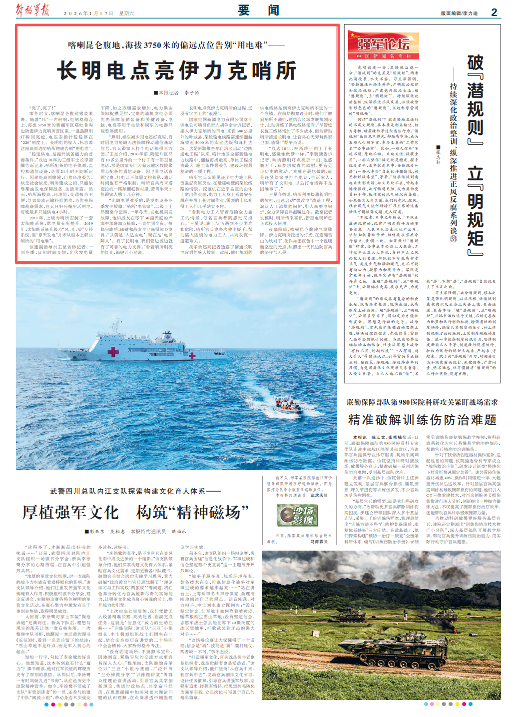 (来源:学习军团) 喀喇昆仑腹地,海拔3750米的偏远点位告别"用电难"—— 长明电点亮伊力克哨所 ■解放军报记者 李子怡 2011年,上级为哨所安装了一套太阳能系统,供电量有所提升。2019年,太阳能系统升级为"风、光、柴"互补系统,但"靠天发电"并未从根本上解 决哨所的"用电难"。 该连副指导员王星告诉记者,一到冬季,日照时间变短,光伏发电量下降,加之取暖需求增加,电力供应依旧捉襟见肘,宝贵的油机发电必须优先 保障值勤装备和关键设备,电脑、电视等用于生活和娱乐的电器只能暂停使用。 "照明、娱乐减少用电还好克服,有时因电力短缺无法保障移动通信基站信号,官兵跟家人打个电话都很不方便。"王星介绍,2010年前,附近片区 只有10多公里外的一个村子有一部卫星电话,那是国家专门为偏远地区牧民聚居点配备的通信设备。因卫星电话资源宝贵,打电话不仅需要排长 队,通话时间也有严格限制。哨所官兵周末搭拖拉机一路颠簸赶到村里,苦等半天才能跟家人聊上几分钟。 "比缺电更难受的,是发电设备冬季发生故障。"哨所"电管家"、二级上士郎键至今记得,一年冬天,发电机突发故障,他和战友在零下30摄氏度的 严寒中加班加点抢修,一直忙到半夜。抢 ...