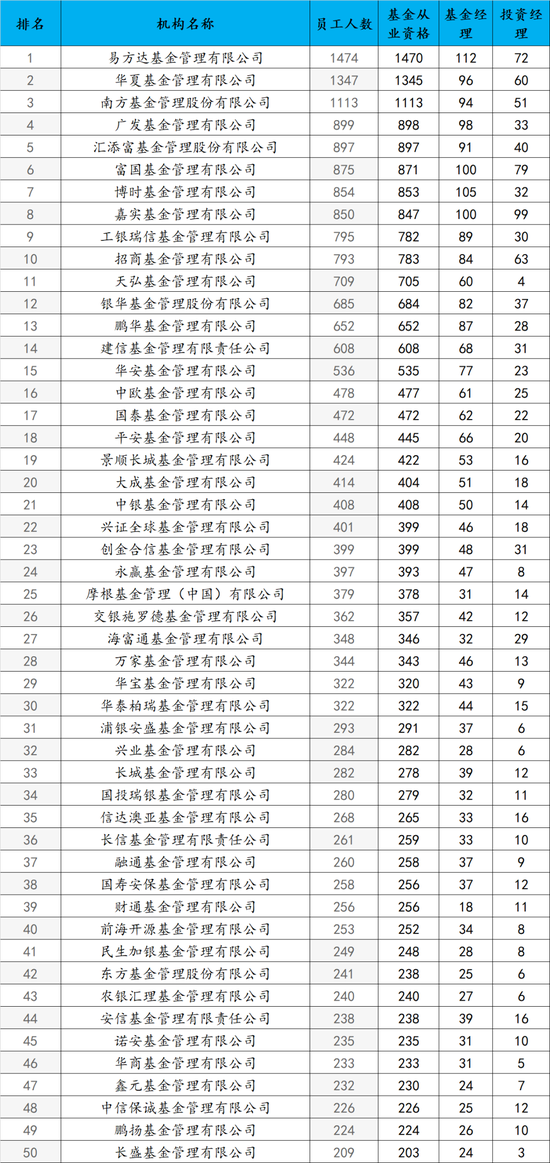 来源:小基慢跑 之前统计过这个数据,现在统计下年末的,希望2026年末的时候做个对比,看看各家基金公司人员数量 的变化。 从整体来看,全行业共计有150家基金公司纳入统计,员工总数达33647人。其中,拥有基金从业资格的 人数为33469人,基金经理总计3782人,投资经理为1547。数据显示,基金行业人才资源呈现出显著的 头部集中效应,不同梯队公司规模差异巨大。 | 排名 | 机构名称 | 员工人数 | 基金从 | 基金经 | 投资经 | | --- | --- | --- | --- | --- | --- | | | | | 业资格 | 源 | 报 | | 1 | 易方达基金管理有限公司 | 1474 | 1470 | 112 | 72 | | 2 | 华夏基金管理有限公司 | 1347 | 1345 | ેર | ୧୦ | | 3 | 南方基金管理股份有限公司 | 1113 | 1113 | 04 | 51 | | 4 | 广发基金管理有限公司 | 899 | 898 | 98 | 33 | | 5 | 汇添富基金管理股份有限公司 | 897 | 897 | 91 | 40 | | ୧ | 富国基金管 ...