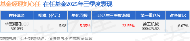 证券之星消息,截止2025年三季度末,基金经理刘心任管理的华夏翔阳LOF(501093)季度净值涨 23.55%。 | 华夏翔旧LOF 501093 | | 5.98 | 5.35% | | 23.55% | 徐工机械 000425.SZ | 6.07% | | --- | --- | --- | --- | --- | --- | --- | --- | | 在任基金 | 规模(亿元) | | 年化回报 | 2025年三季度涨幅 | | 第一重合股 | 日净值比 | 刘心任在担任九泰锐富事件驱动混合发起式(LOF)A(168102)基金经理的任职期间累计任职回报 127.93%,平均年化收益率为25.14%。期间重仓股调仓次数共有46次,其中盈利次数为31次,胜率为 67.39%;翻倍级别收益有3次,翻倍率为6.52%。 以下为刘心任所任职基金的部分重仓股调仓案例: | 股票名称 | 调入季度 | 调出季度 | 持有期间公司业绩增长 | 收益率估算 | | --- | --- | --- | --- | --- | | 东方雨到 | 23年2季度 | 24年2季度 | -14.52% | -46.68% | ...