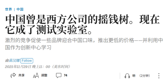 来源:军哥漫谈 11月29日,美媒《华尔街日报》的一篇报道揭示了一个引人深思的现象:中国市场已经成为全球竞争最 激烈的练兵场。 能在这里胜出的企业,往往具备了在全球市场脱颖而出的能力。 这一观点的背后,是中国市场角色的根本性变化,以及本土品牌的全面崛起。 《华尔街日报》表示,过去几十年,中国市场曾是外资企业的"摇钱树"。 改革开放后,大批国际品牌进入中国,从家电到汽车,从奢侈品到快消品,几乎每个领域都能看到它们 的身影。 星巴克、耐克、苹果等品牌曾在中国市场轻松赚得盆满钵满。 然而,随着中国经济的快速发展和本土品牌的强势崛起,这种局面已经发生了根本性变化。 如今的中国市场,已成为全球竞争最为激烈的战场。 外资企业不仅要面对本土品牌的强势竞争,还需要适应中国消费者日益挑剔的需求。 能够在这样残酷的环境中生存并胜出的企业,显然拥有极强的竞争力。 中国本土品牌的崛起并非偶然,而是多种因素共同作用的结果。 首先,中国连续多年蝉联世界第一大制造业国家,制造业的综合实力为本土品牌提供了强大的技术和生 产支撑。 以新能源汽车为例,比亚迪、蔚来、小鹏等品牌不仅在国内市场站稳脚跟,还逐步走向国际市场,与特 斯拉等国际巨头展开正 ...
