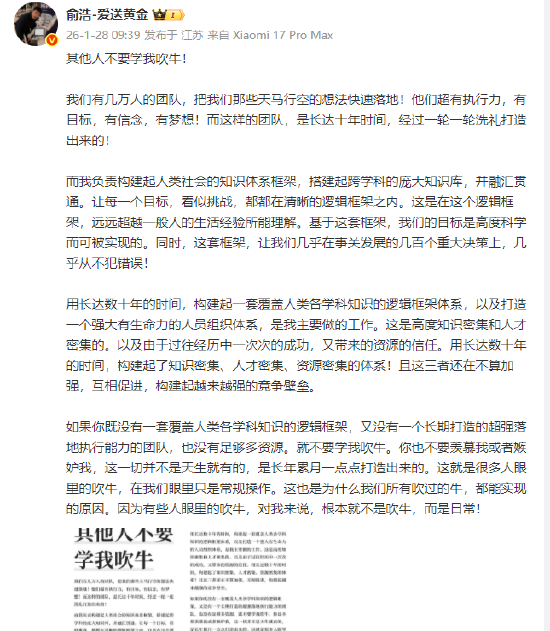 追觅俞浩:其他人不要学我吹牛 1月28日,追觅科技创始人兼CEO俞浩在社交媒体发文表示,如果你既没有一套覆盖人类各学科知识的 逻辑框架,又没有一个长期打造的超强落地执行能力的团队,也没有足够多资源。就不要学我吹牛。 在做垂直品牌的时候,最主要是做好产品,做 好技术,讲好产品创新和功能。而到国民品牌 的时候,受众是很宽泛的。有的需要更广谱的 了解,比如明星和春晚带来知名度的上升。有 些需要更深度的解读,比如这家公司背后的哲 学体系,社会思考,价值观等等。在做垂直品 牌的时候,都是不需要的。在做国民品牌的时 候,就需要了。而所谓IP,只是传播方式中的 一种。如果不理解这个目的,做了IP也没 用。如果理解这个,也不需要刻意打造一个虚 假的IP,该是怎样就是怎样,实实在在表达自 己的想法即可。 6 小时前 江苏 回复 ♡ 43 (-) 俞浩在回复网友留言时否认了要学雷军、刘强东打造个人 IP。他表示,追觅要从垂直赛道的专业品牌 成为国民品牌。"最近不光是我,我也让很多公司的同事开通了社交媒体账号,就是因为要从一个专业 品牌到国民品牌,需要让更多人全方面地了解我们。" 他指出,做垂直品牌的时候,最主要是做好产品,做好技 ...