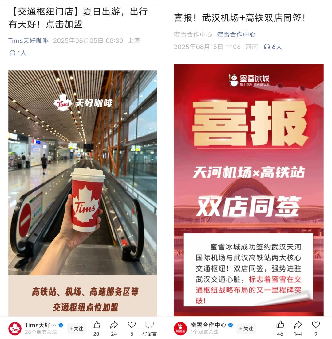 餐饮大佬们,都盯上了机场、高铁站 高铁、机场、高速服务区……突然成了"香饽饽",头部品牌纷纷抛出布局计划。 8月末,在2025年第二季度财报业绩会上,Tims天好中国首席执行官卢永臣表示品牌将在更多优质的交通点位布局,"把Tims开进更多高铁站、机场、高 速服务区打造'旅途补给站'。同时,增加对医院、学校、银行等特渠门店的覆盖力度。" 不止Tims,一路狂飙的"雪王",也表示出了品牌对交通枢纽点位的重视。自2024年起,蜜雪冰城就不断调整开店及加盟政策,今年6月更是将门店保护范 围扩大3倍,有不少加盟商表示调整后的开店门槛更高,品牌对点位的审核速度也已经放慢。 ◎图片来源:品牌官方公众号 尽管开店政策历经数次调整,但蜜雪冰城始终鼓励加盟商进入包含交通枢纽在内的未饱和的特殊渠道。8月中旬,蜜雪合作中心官方账号上,还专门就蜜 雪冰城签约武汉天河国际机场与武汉高铁站发布了喜报。 此前执着于"开大店"的霸王茶姬,也悄悄增加了交通枢纽店的比例。 中信证券研报显示,此前霸王茶姬有约80%左右的门店首选在一二线城市的购物商场、写字楼,并对门店面积有一定要求,但今年,这部分比例下降到了 60%左右。新开门店中,社区街边店、交 ...