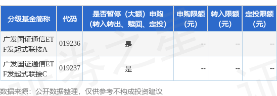 证券之星消息,11月25日广发基金管理有限公司发布《关于广发国证通信交易型开放式指数证券投资基 金发起式联接基金暂停机构投资者大额申购(含转换转入、定期定额和不定额投资)业务的公告》。公 告中提示,为保护基金份额持有人利益,自2025年11月25日起广发国证通信交易型开放式指数证券投资 基金发起式联接基金暂停机构投资者大额申购(含转换转入、定期定额和不定额投资)业务,申购、转 换转入上限金额为10.0万元,下属分级基金调整明细如下: 以上内容为证券之星据公开信息整理,由AI算法生成(网信算备310104345710301240019号),不构成 投资建议。 | 分级基金简称 | 代码 | 是否暂停(大额)申购 | 申购限额 转入限额 定投限额 | | --- | --- | --- | --- | | | | (转入转出、赎回、定投) | (元) (元) (元) | | 广发国证通信ET F发起式联接A | 019236 | 분 | | | 广发国证通信ET F发起式联接C | 019237 | 를 | | ...