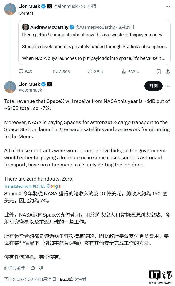 IT之家 8 月 22 日消息,SpaceX CEO 埃隆・马斯克昨天在 X 平台透露,SpaceX 今年将从 NASA(美国国家航空航天局)获得大约 10 亿美元(现汇率约合 71.8 亿元人民币)的收入,约占其 150 亿美元(现汇率约合 1076.94 亿元人民币)总收入的 7%。 同时马斯克还表示,NASA 还将就运送宇航员 / 货物到空间站、发射卫星及重返月球的工作向 SpaceX 支付费用。 马斯克还回应了"NASA 和 SpaceX 的合作是在浪费纳税人的钱"观点,他表示 NASA 的合约都是通过招标投标获得,NASA 选择 SpaceX 自有理由,同时 NASA 也无法单独安全运输宇航员。 后续有网友发布了"SpaceX 的收入可能会超过 NASA 全部预算"的观点,马斯克肯定了这个观点,并表示:"明年"。 根据美国政府今年 5 月公布的 2026 财年支出预算提案,NASA 在 2026 财年的预算是 188 亿美元(IT之家注:现汇率约合 1349.76 亿元人民币),相较 2025 财年实际获得的 249 亿美元(现汇率约合 1787.71 亿元人民币)下降了近 25%。 ...