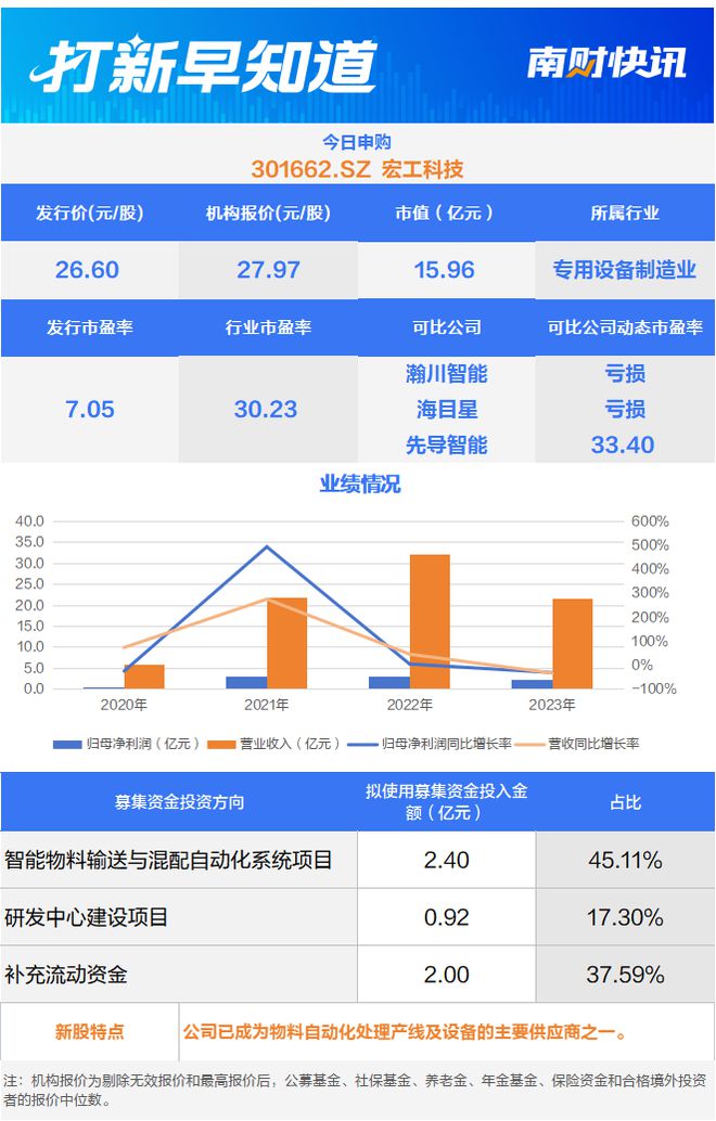 4月8日,有一只新股申购,为创业板的宏工科技(301662.SZ);另有一只新股上市,为沪市主板的中 国瑞林(603257.SH)。 一只新股申购 宏工科技(301662.SZ)聚焦于粉料、粒料、液料、浆料等散装物料的自动化处理产线及设备的研发、 生产和销售,是一家具有自主核心设备、配件和软件的物料自动化处理方案解决商。 | 今日申购 | | | | | --- | --- | --- | --- | | 301662.SZ 宏工科技 | | | | | 发行价(元/股) | 机构报价(元/股) | 市值(亿元) | 所属径业 | | 26.60 | 27.97 | 15.96 | 专用设备制造业 | | 发行市盈率 | 行业市盈率 | 可比公司 | 可比公司动态市盈率 | | 7.05 | 30.23 | 潮川智能 | 亏损 亏损 | | | | 海岸星 | | | | | 先导智能 | 33.40 | | 业绩情况 | | | | | 40.0 | | | 600% | | 35.0 | | | 500% | | 30.0 | | | 400% | | 25.0 | | | 300% | | 20.0 1 ...
