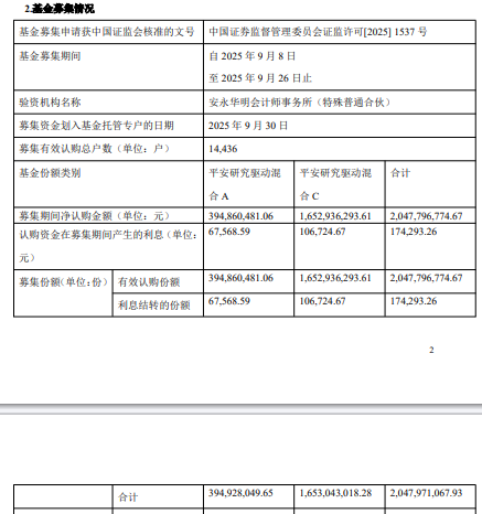| 基金募集申请获中国证监会核准的文号 | | 中国证券监督管理委员会证监许可[2025] 1537 号 | | | | --- | --- | --- | --- | --- | | 基金草集期间 | | 自2025年9月8日 | | | | | | 至2025年9月26日止 | | | | 验资机构名称 | | 安永华明会计师事务所(特殊書通合伙) | | | | 募集资金划入基金托管专户的日期 | | 2025年9月30日 | | | | 募集有效认购总户数(单位:户) | | 14 436 | | | | 基金份额类别 | | 平安研究驱动混 | 平安研究驱动混 | 合计 | | 募集期间净认购金額(单位:元) | | 合A 394 860 481.06 | 合 C 1.652.936.293.61 | 2.047.796.774.67 | | 认购资金在募集期间产生的利息(单位: | | 67.568.59 | 106,724.67 | 174,293.26 | | 元) | | | | | | 募集份额(单位:份) | 有效认购份额 | 394 860 481.06 | 1,652,936,293 ...