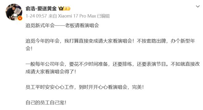中经记者 杨让晨 石英婧 上海报道 1月26日,追觅科技官宣将于2月4日在苏州奥林匹克体育中心举办《敢梦敢为·追觅之夜》演唱会。"这 场与央视联合主办的盛大庆典,是追觅为全体员工打造的一场新式年会。"追觅科技方面表示。 《中国经营报》记者注意到,在此前的1月24日,追觅科技创始人俞浩在社交平台发文称:"追觅今年的 年会,打算直接变成请大家看演唱会,不按套路出牌,办个新型年会!自己的员工自己宠!"在1月25 日,俞浩还发微博表示,将加码抽取1000张演唱会门票。 据了解,一直以来,追觅科技持续加大在员工福利与保障层面的投入。此前,追觅为员工发放黄金福利 曾引发社会关注,其推出的"家庭健康保障计划",为全体员工及直系亲属投保的重疾险、防癌险,费用 由企业全额承担。配合"重奖激励"、夜宵节、家属开放日等多元举措,追觅逐步构建起覆盖"物质支持 +情感连接+长期保障"的立体化关怀体系。此次演唱会即是年终福利之一,追觅将在演唱会上把科技元 素与艺术表达有机融合,呈现产品力和技术优势。 据追觅方面公布的数据,截至目前,追觅的产品与服务已进入全球120余个国家和地区,全球实体门店 数量超过6500家,累计服务家庭超4200万 ...
