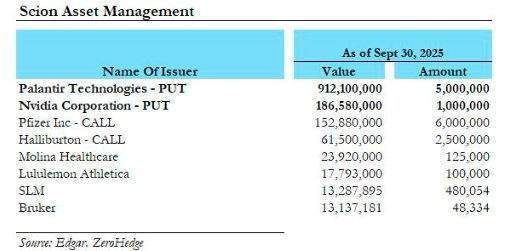 图解丨大空头Michael Burry旗下Scion 25Q3做空Palantir、英伟达面临...