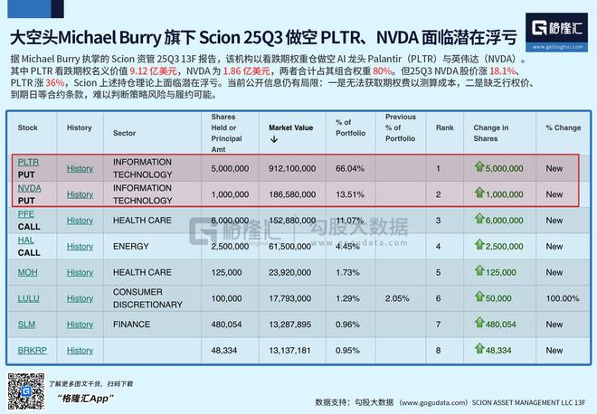 格隆汇11月4日|据Michael Bury执掌的Scion资管25Q3 13F报告,该机构以看跌期权重仓做空AI龙头 Palantir(PLTR)与英伟达(NVDA)。其中,PLTR看跌期权名义价值9.12亿美元,NVDA为1.86亿美元,两 者合计占其组合权重80%。但25Q3英伟达股价涨18.1%、Palantir涨36%,Scion上述持仓理论上面临潜在 浮亏。当前公开信息仍有局限:一是无法获取期权费以测算成本,二是缺乏行权价、到期日等合约条 款,难以判断策略风险与履约可能。 | Stock | History | Sector | Shares Held or | Market Value | % of | Previous % of | Rank | Change in | % Change | | --- | --- | --- | --- | --- | --- | --- | --- | --- | --- | | | | | Principal | → | Portfolio | Portfolio | | Shares | | | | | | Amt | | | | | | | | Pl ...