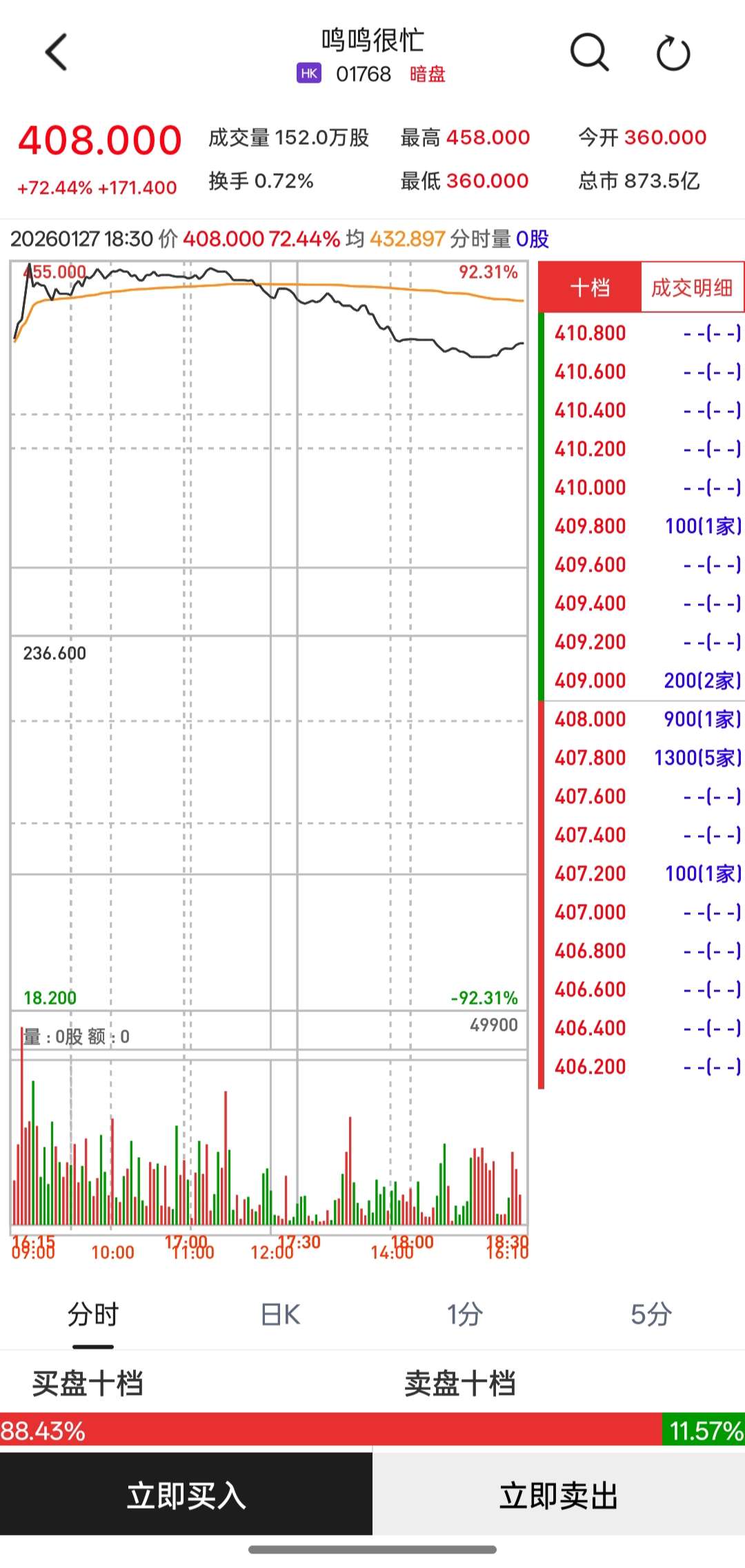 据悉,鸣鸣很忙此次IPO吸引了腾讯、淡马锡、贝莱德等8家顶级机构组成豪华基石阵容,累计认购1.95 亿美元,凸显资本市场对其赛道地位与增长潜力的认可。 中国零食商"零食很忙"和"赵一鸣零食"母企、被称为"量贩零食第一股"的鸣鸣很忙(1768.HK)即将于明 日在港挂牌上市,该股在目前的富途暗盘交易中暴涨,盘中一度涨超90%至450港元,一手100股,账面 赚21340港元。 | 01768 呜呜很忙 | | | | --- | --- | --- | | 430,400 ↑ +193.800 +81.91% 暗盘交易中 01/27 17:24 | | | | * % % (9 目 ♥ 白选 | | ● 快捷交易 | | 最高价 450.000 | 开盘价 353.000 | 成交量 93.55万 | | 最低价 353.000 | 昨收价 236.600 | 成交额 4.01亿 | | 平均价 428.661 | 市盈率TM 43.33 | 总市值 921.49亿 … | | 振 幅 41.00% | 市盈率(静) 98.69 | 总股本 2.14亿 | | 换手率 0.44% | 市净率 11.391 | ...