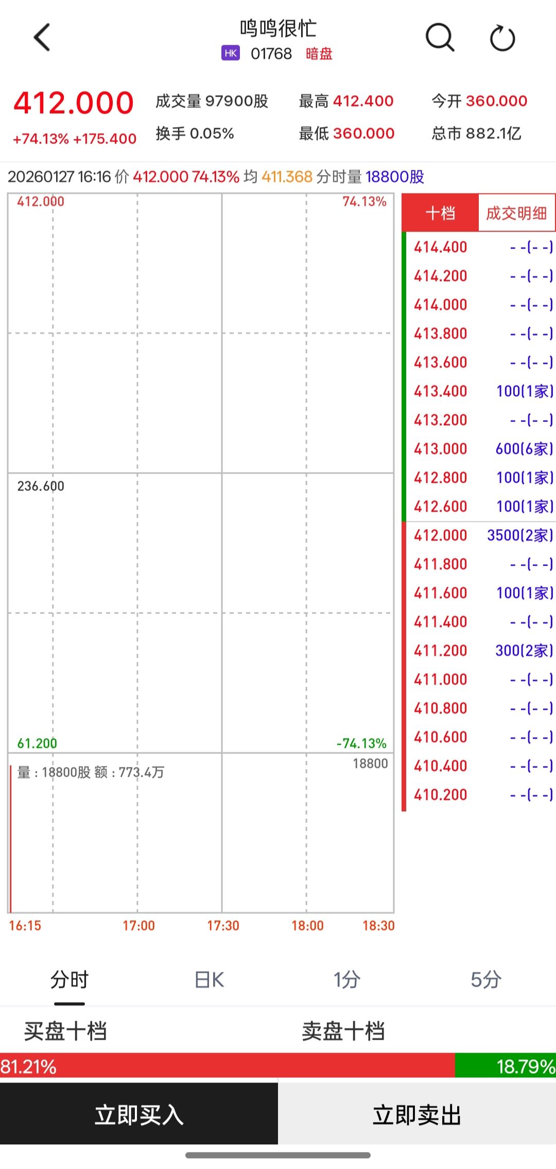 | 412.000 | 74.13% | | | | --- | --- | --- | --- | | | | 十档 | 成交明细 | | | | 414.400 | - - (- - ) | | | | 414.200 | - - (- - ) | | | | 414.000 | - - (- - ) | | | | 413.800 | - -(- -) | | | | 413.600 | - - (- -) | | | | 413.400 | 100(1家) | | | | 413.200 | - - (- -) | | | | 413.000 | 600(6家) | | 236.600 | | 412.800 | 100(1家) | | | | 412.600 | 100(1家) | | | | 412.000 | 3500(2家) | | | | 411.800 | -- - (- - ) | | | | 411.600 | 100(1家) | | | | 411.400 | - - - - - - ) | | | | 411.200 | 300(2家) | | | | 411.000 | - - ...
