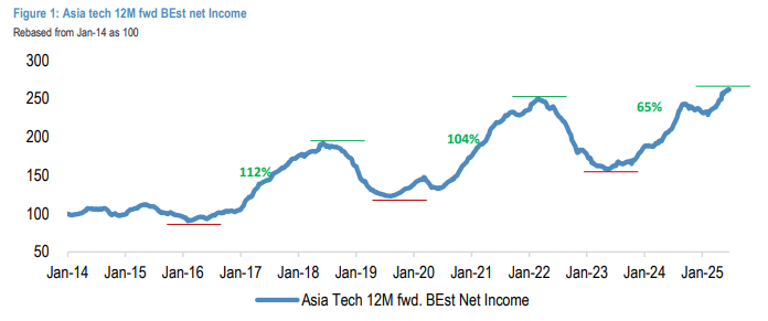 该投行预计这种"不安的缓慢上涨"模式将持续4-5个季度,关键驱动因素是AI算力需求仍远超供给能 力,至少要到2026年中期才可能缓解。到2027年,AI加速器供应最终追上需求后,前景可能开始走 弱。 摩根大通认为,得益于AI领域的强劲势头,亚洲科技股今年或能再涨15-20%。 据追风交易台消息,摩根大通分析师Gokul Hariharan领衔的团队在最新研报中指出,2025年数据中心资 本支出增长以及对2026年增长的更大信心,将为AI股票提供持续动力。 报告数据显示,彭博半导体指数今年以来已上涨超过12%,表现优于亚洲整体股市基准。 报告预计,AI将成为本轮上涨周期的核心驱动力,相关股票将在未来三个月内持续领涨,亚洲科技股 今年可能再上涨15%至20%。 对于非AI领域,摩根大通保持谨慎态度,但看好折叠屏iPhone和智能眼镜等新兴主题在2025年底的投资 机会。 AI需求强劲,"供不应求"有望持续到2026年 报告指出,当前正处于AI硬件主导的科技上升周期的中后期,并出现了典型的周期性信号——AI需求 驱动力持续强劲,市场讨论转向更细分的需求结构。 非AI领域保持谨慎,新兴主题值得关注 AI股估值回归均值 ...