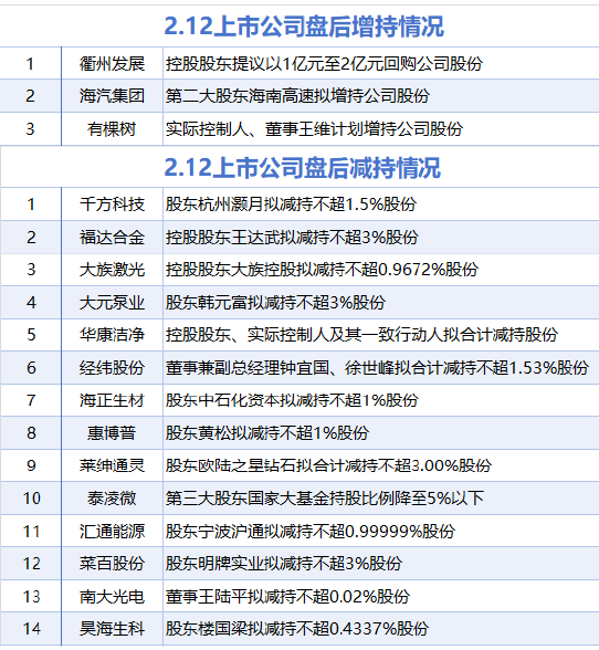 据统计,1月13日,盘后衢州发展、海汽集团、有棵树披露增持情况。包括千方科技、福达合金、大族 激光、大元泵业、华康洁净、经纬股份、海正生材、惠博普、莱绅通灵、泰凌微、汇通能源、菜百股 份、南大光电、昊海生科在内的14家A股上市公司披露减持情况。 | 1 | 衢州发展 | 控股股东提议以1亿元至2亿元回购公司股份 | | --- | --- | --- | | 2 | 海汽集团 | 第二大股东海南高速拟增持公司股份 | | 3 | 有棵树 | 实际控制人、董事王维计划增持公司股份 | | | | 2.12上市公司盘后减持情况 | | 1 | 千方科技 | 股东杭州灏月拟减持不超1.5%股份 | | 2 | 福达合金 | 控股股东王达武拟减持不超3%股份 | | 3 | 大族激光 | 控股股东大族控股拟减持不超0.9672%股份 | | র্ব | 大元泉业 | 股东韩元富拟减持不超3%股份 | | 5 | や康洁浄 | 控股股东、实际控制人及其一致行动人拟合计减持股份 | | 6 | 经纬股份 | 董事兼副总经理钟宜国、徐世峰拟合计减持不超1.53%股份 | | 7 | 海正生材 | 股东中石化资本拟减持不超1 ...