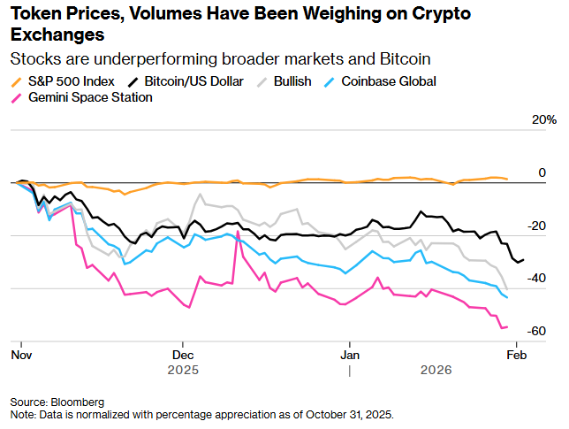 Core Insights - The recent decline in cryptocurrency appears different from past downturns, lacking major scandals or regulatory crackdowns, yet major exchanges are experiencing significant impacts [1][7] - Bitcoin has dropped over 35% since its peak last October, with exchanges like Coinbase, Gemini, and Bullish seeing stock price declines of 40% to 55% in the past three months due to plummeting trading volumes [1][6] - Analysts have significantly lowered their expectations for these exchanges, with projections indicating a potential 40% year-over-year decline in Coinbase's Q4 trading volume to $264 billion [1][6] Market Dynamics - Investors are increasingly withdrawing from risk assets, including cryptocurrency stocks, due to concerns over rising costs in AI, geopolitical uncertainties, and a rotation of funds away from tech stocks [4] - Bitcoin's price fell nearly 11% in January, marking its fourth consecutive month of decline, the longest losing streak since 2018 [6] - The current market downturn is characterized by a lack of significant triggering events, unlike previous downturns that were marked by regulatory actions or industry failures [7][8] Trading Behavior - Market participants are not engaging in panic selling but are instead choosing to exit the market due to concerns about future shocks [8] - Retail interest in cryptocurrencies is waning, with many traders opting to hold rather than trade amid regulatory uncertainties [7][8] - Some larger exchanges are attempting to mitigate impacts by diversifying into areas like digital asset custody and stock trading, but the relief is limited [8] Future Outlook - Analysts suggest that the current market cycle may require an additional six to nine months for a noticeable recovery, with trading activity shrinking to levels comparable to previous downturns [6][7] - The cryptocurrency industry is facing a potential legislative resolution as representatives from the crypto and banking sectors are set to discuss a market structure bill in Washington [8]