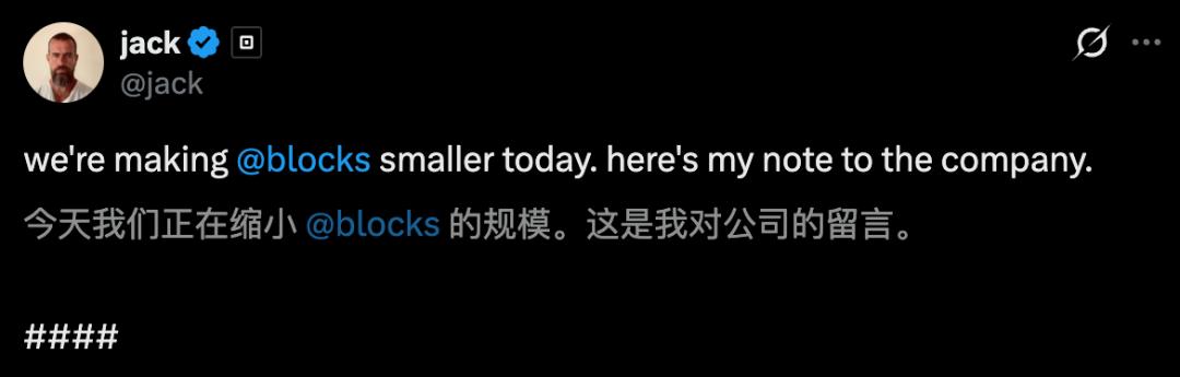 人类已无后路?今天,硅谷支付巨头Block暴裁40%员工,股价却疯涨25%。联创Jack Dorsey千字全员信:与其缓慢等死,不如用AI替代平庸打工人。 4000人竟因AI,一夜原地失业! 就在刚刚,创始人Jack Dorsey的一封全员信,毫无征兆地裁掉了Block 40%的员工。 硅谷支付巨头员工总数,从1万多人的规模,直接骤降至6000人。 如此激进的「瘦身」,只有一个原因:AI时代不需要那么多人了。 用Jack的原话来说—— 我们发现,如今我们打造和使用的各种智能工具,加上更精简、扁平的团队架构,正在催生一种全新的工作模式。 这彻底颠覆了创办和运营一家公司的意义。而且,这种趋势正在加速。 最离谱的是,对4000人痛下杀手后,Block的股价却在盘后疯狂飙升,涨幅一度超25%。 Akshay Saini � @akshaymarch7 · 2h Whaaaaaaaaaaaat!??? And the stock price is up +25% with this news. The markets are now celebrating layoffs as a positive sign, as ...