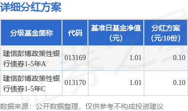 本次分红对象为权益登记日登记在册的本基金全体份额持有人。,权益登记日为10月29日,现金红利发 放日为10月30日。选择红利再投资方式的投资者其红利再投资的份额将于2025年10月30日直接计入其基 金账户,2025年10月31日起可以查询。根据财政部、国家税务总局的相关规定,基金向投资者分配的基 金收益,暂免征收所得税。本基金本次分红免收分红手续费;选择红利再投资方式的投资者其红利所转 换的基金份额免收申购费用。 以上内容为证券之星据公开信息整理,由AI算法生成(网信算备310104345710301240019号),不构成 投资建议。 | 分级基金简称 | 代码 | 基准日基金净值 | | 分红方案 | | | --- | --- | --- | --- | --- | --- | | | | (元) | | (元/10份) | | | 建信彭博政策性银 行债券1-5年A | 013169 | | 1.01 | | 0.10 | | 建信彭博政策性银 行债券1-5年C | 013170 | | 1.01 | | 0.10 | 证券之星消息,10月29日发布《建信彭博政策性银行债券1-5年指数证券投资基金分 ...