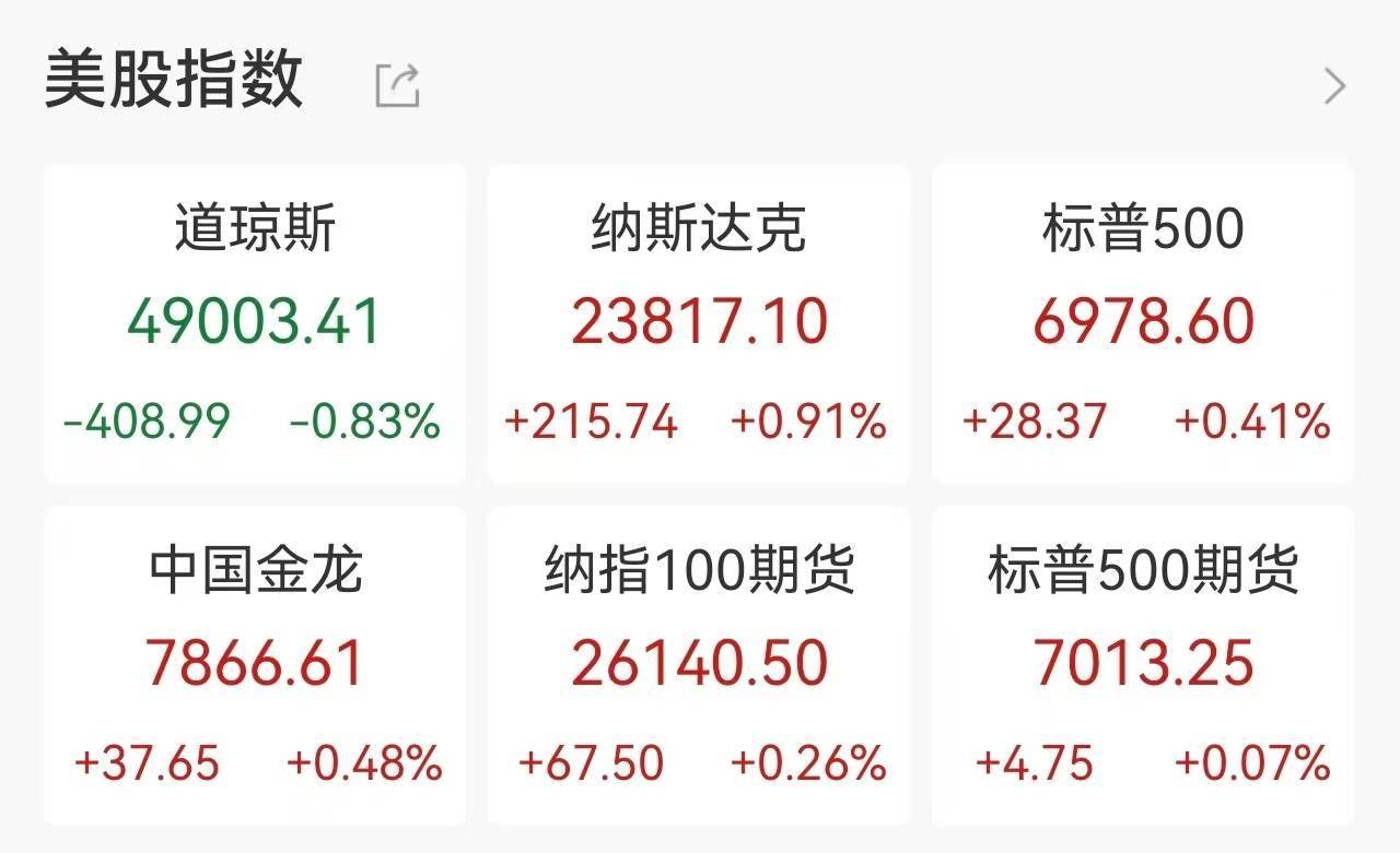 当地时间1月27日,美国金融市场再度上演分化行情。科技股的强劲表现推动纳斯达克综合指数上涨0.91%,收于23817.10点,标普500指数同步攀升0.41%至 6978.60点,连续第五个交易日收涨并创下历史新高。然而道琼斯工业平均指数在医疗保险股暴跌拖累下收跌0.83%,报49003.41点,显示出市场内部明显的 结构性波动。 | 美股指数 | | | | --- | --- | --- | | 道琼斯 | 纳斯达克 | 标普5( | | 49003.41 | 23817.10 | 6978. | | -408.99 -0.83% +215.74 +0.91% +28.37 + | | | | 中国金龙 | 纳指100期货 | 标普500 | | 7866.61 | 26140.50 | 7013.2 | | +37.65 +0.48% +67.50 +0.26% +4.75 + | | | | くつ | 万得美国科技七巨头指数(MAGS) | | | | --- | --- | --- | --- | | | 66893.16 737.38 1.11% | | | | 资料 成分 | 资讯 相关基金 | ...